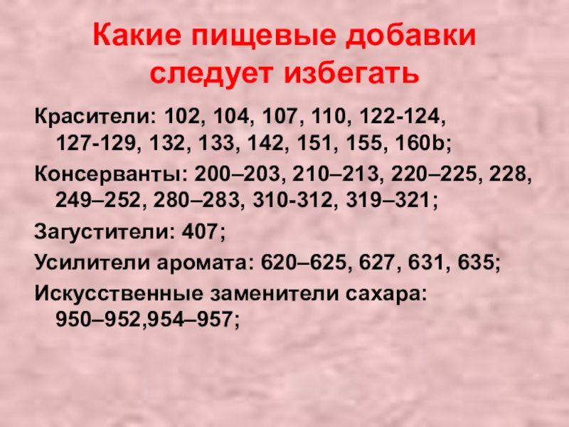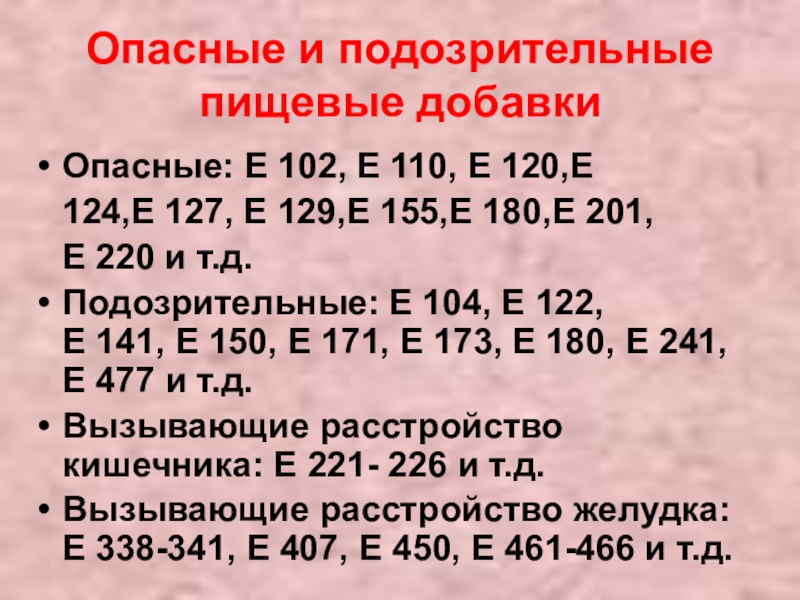 Подозрительные: Е 104, Е 122, Е 141, Е 150, Е 171, Е 173, Е 180, Е 241, Е 477 и т.д.