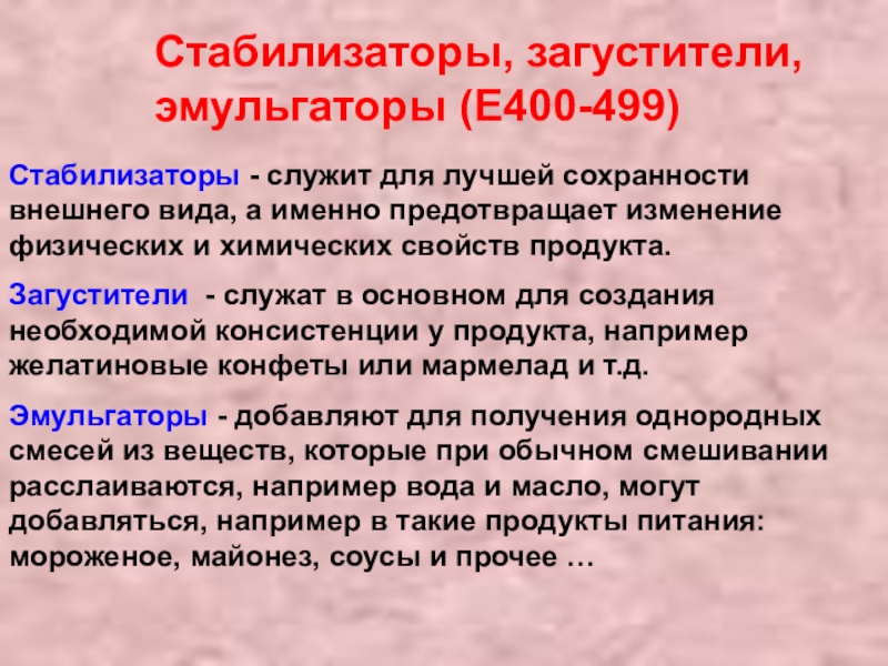 Эмульгаторы - добавляют для получения однородных смесей из веществ, которые при обычном смешивании расслаиваются, например вода и масло, могут добавляться, например в такие продукты питания: мороженое, майонез, соусы и прочее …