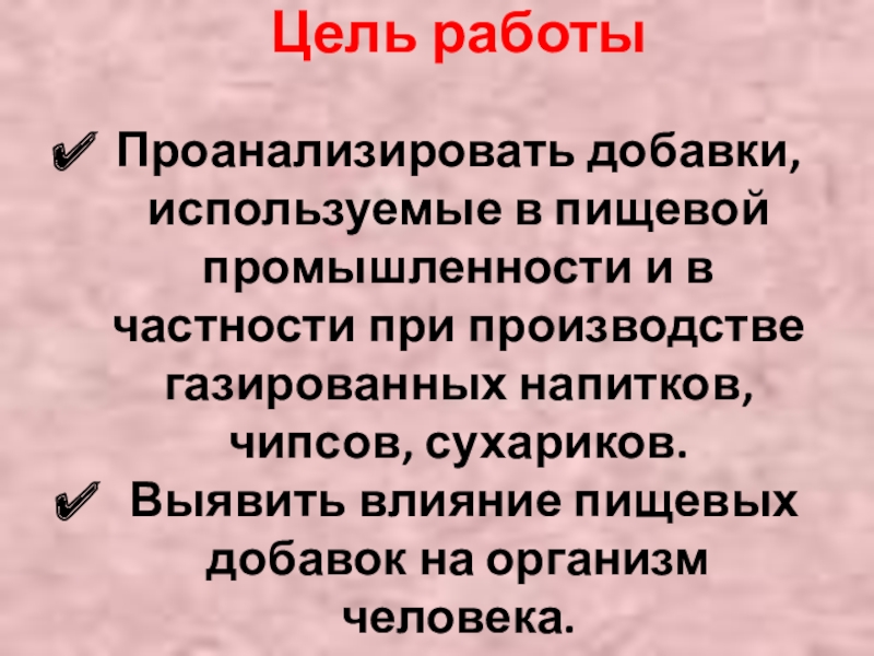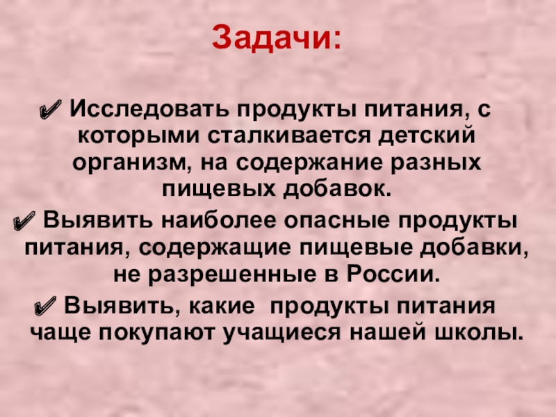 Слайд 6 Исследовать продукты питания, с которыми сталкивается детский организм, на содержание