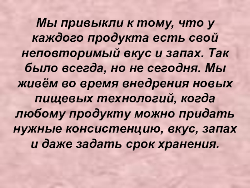 вкус и запах. Так было всегда, но не сегодня. Мы живём во время внедрения новых пищевых технологий, когда любому продукту можно придать нужные консистенцию, вкус, запах и даже задать срок хранения.