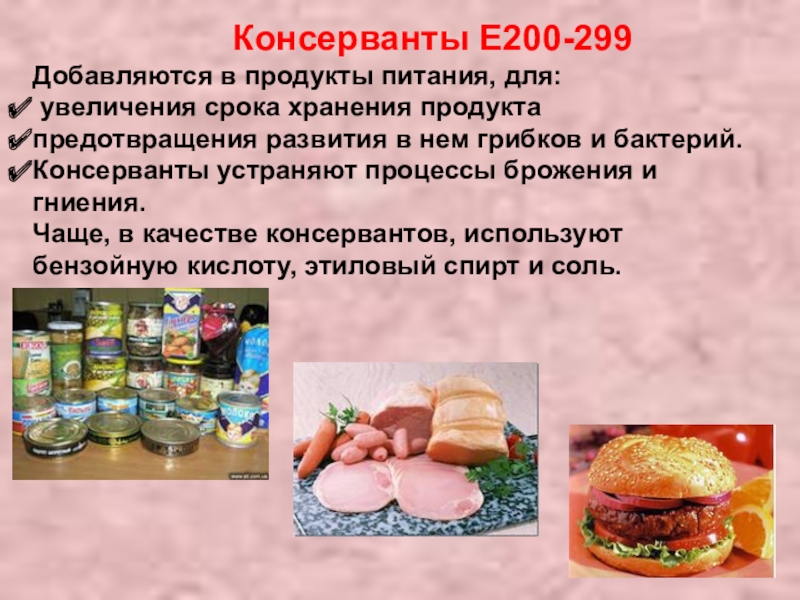 Консерванты: 200–203, 210–213, 220–225, 228, 249–252, 280–283, 310-312, 319–321;