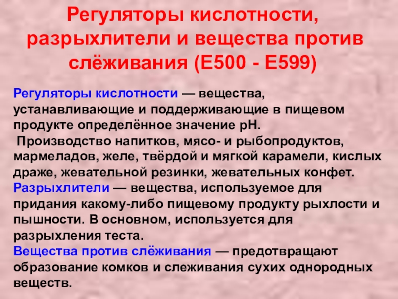 Вещества против слёживания — предотвращают образование комков и слеживания сухих однородных веществ.