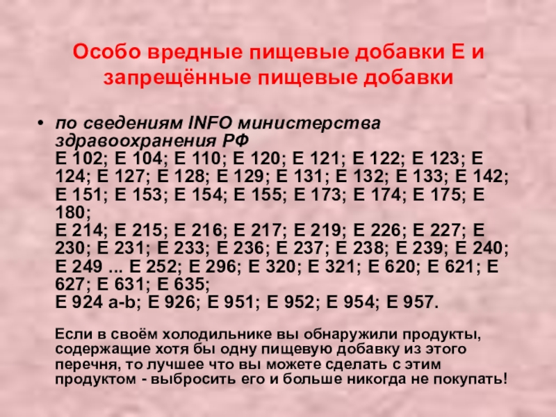 Слайд 37Особо вредные пищевые добавки Е и запрещённые пищевые добавки