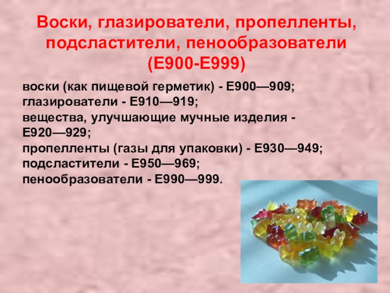 Слайд 33Воски, глазирователи, пропелленты, подсластители, пенообразователи (E900-E999)
