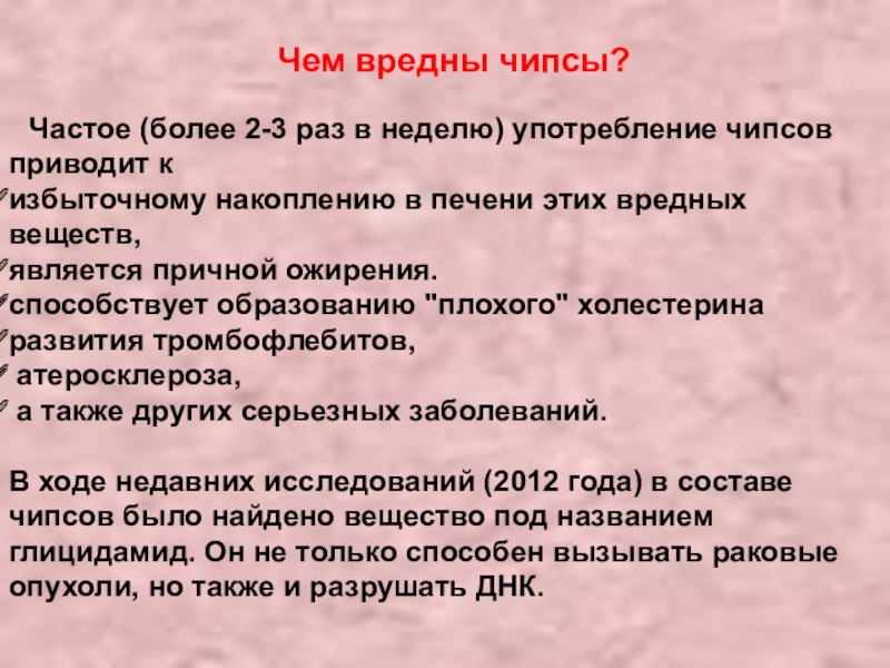 В ходе недавних исследований (2012 года) в составе чипсов было найдено вещество под названием глицидамид. Он не только способен вызывать раковые опухоли, но также и разрушать ДНК.