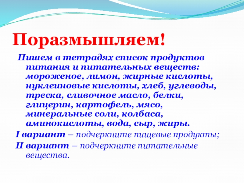 Пишем в тетрадях список продуктов питания и питательных веществ: мороженое,