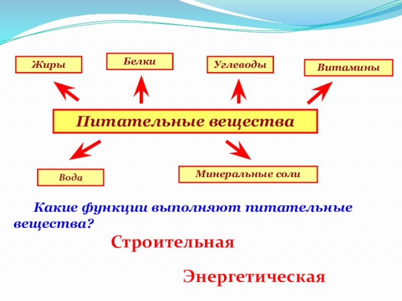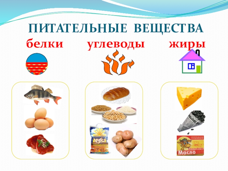 Слайд 8 Питательные вещества – это белки, жиры, углеводы, минеральные соли,