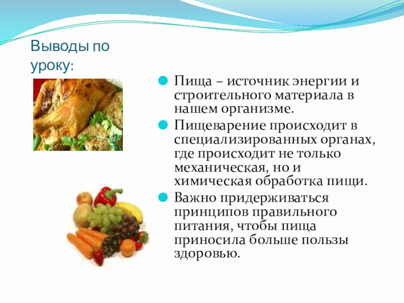 Пищеварение является начальным этапом обмена веществ. Человек получает с пищей энергию и все необходимые вещества для обновления и роста тканей.