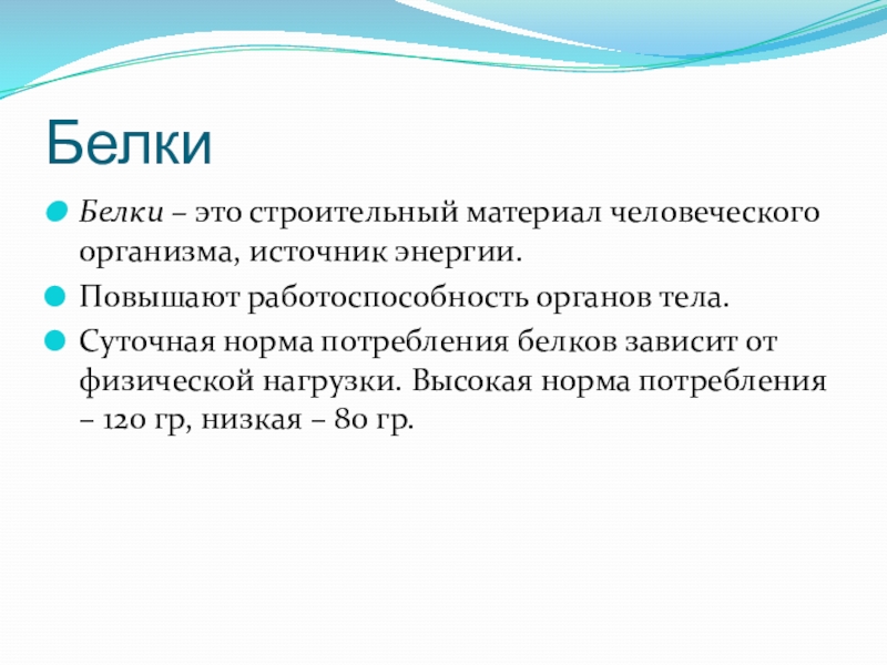 Суточная норма потребления белков зависит от физической нагрузки. Высокая норма потребления – 120 гр, низкая – 80 гр.