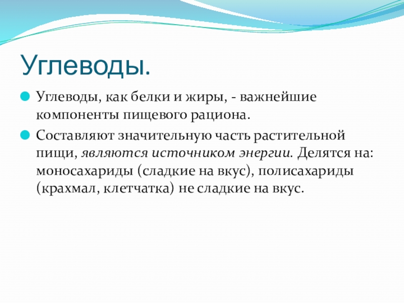 часть растительной пищи, являются источником энергии. Делятся на: моносахариды (сладкие на вкус), полисахариды (крахмал, клетчатка) не сладкие на вкус.