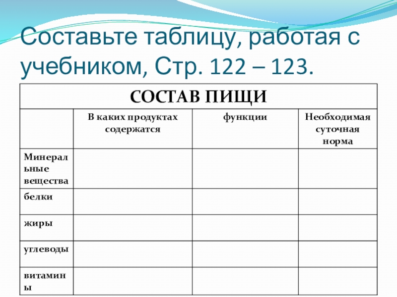 Слайд 16Составьте таблицу, работая с учебником, Стр. 122 – 123.