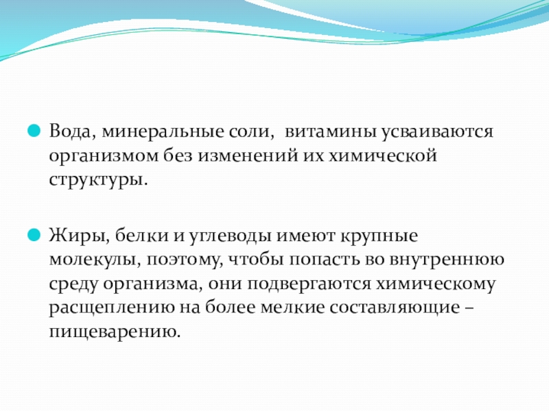 Слайд 14Вода, минеральные соли, витамины усваиваются организмом без изменений их химической структуры.