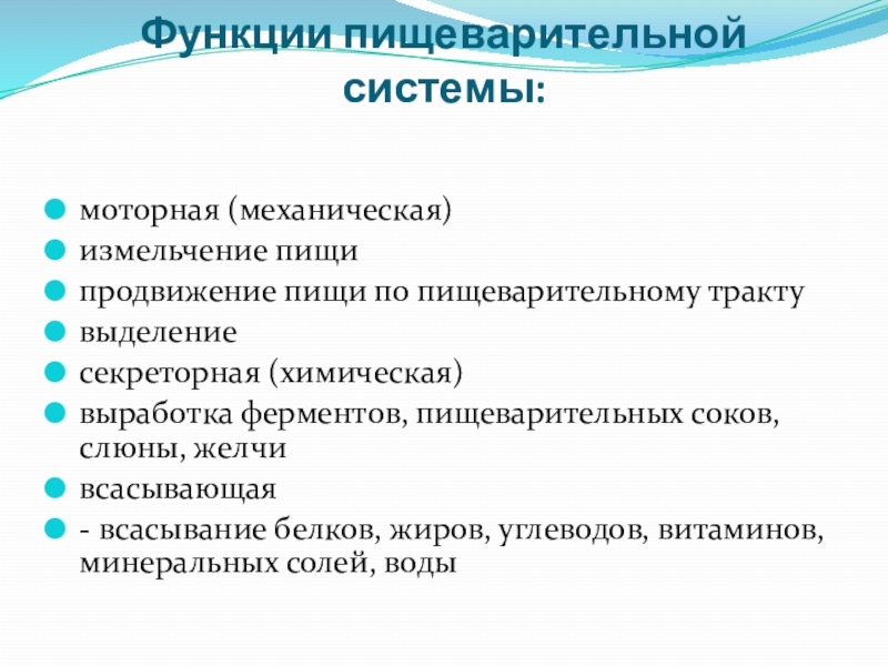 - всасывание белков, жиров, углеводов, витаминов, минеральных солей, воды
