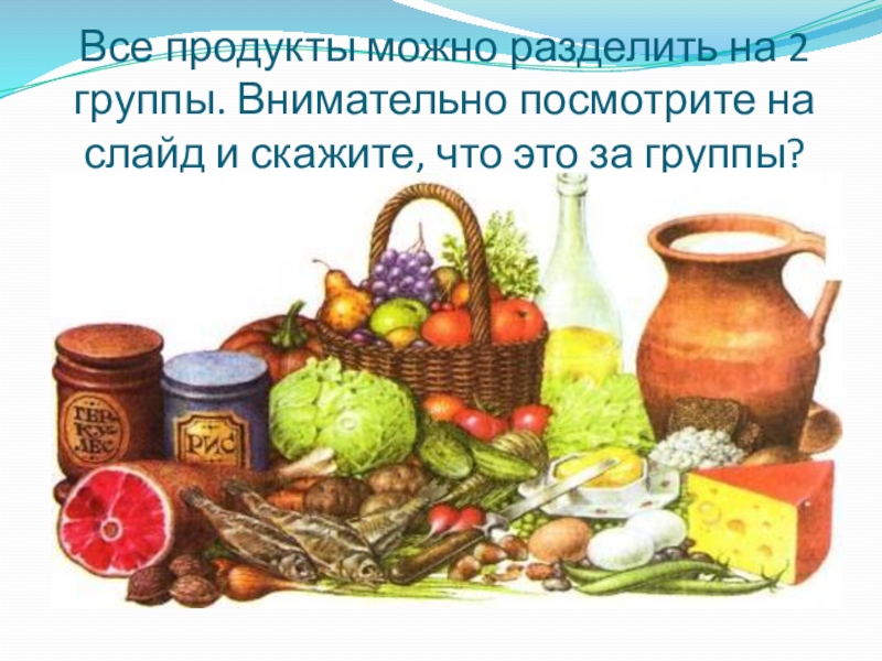 Слайд 5Все продукты можно разделить на 2 группы. Внимательно посмотрите на слайд