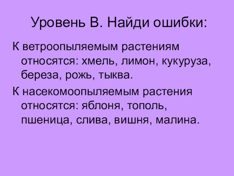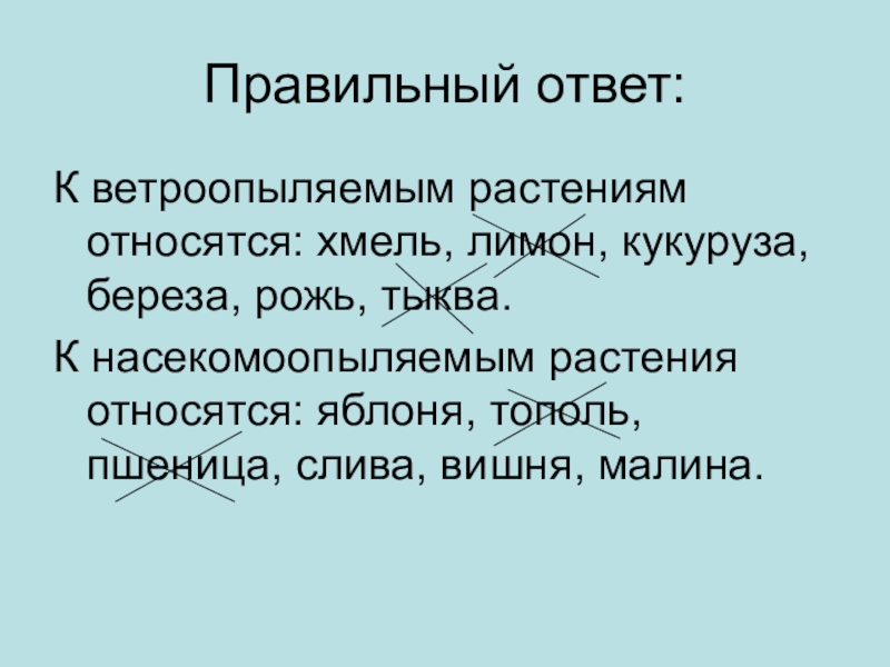 К ветроопыляемым растениям относятся: хмель, лимон, кукуруза, береза, рожь, тыква.