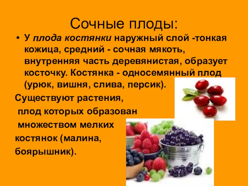 мякоть, внутренняя часть деревянистая, образует косточку. Костянка - односемянный плод (урюк, вишня, слива, персик).