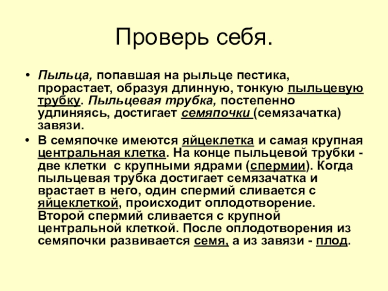В семяпочке имеются яйцеклетка и самая крупная центральная клетка. На конце пыльцевой трубки - две клетки с крупными ядрами (спермии). Когда пыльцевая трубка достигает семязачатка и врастает в него, один спермий сливается с яйцеклеткой, происходит оплодотворение. Второй спермий сливается с крупной центральной клеткой. После оплодотворения из семяпочки развивается семя, а из завязи - плод.