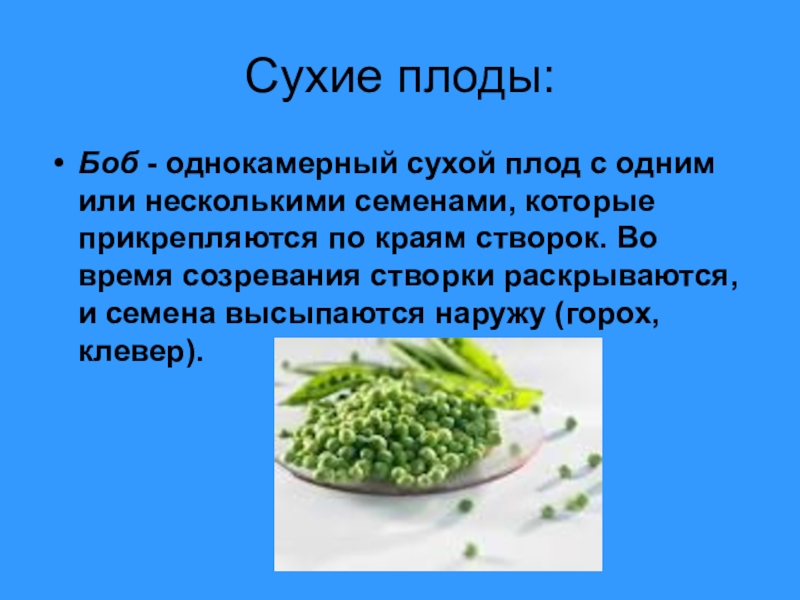 Боб - однокамерный сухой плод с одним или несколькими семенами,