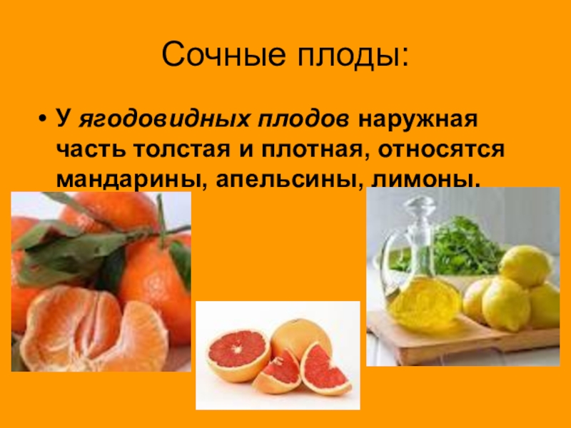 У ягодовидных плодов наружная часть толстая и плотная, относятся мандарины,