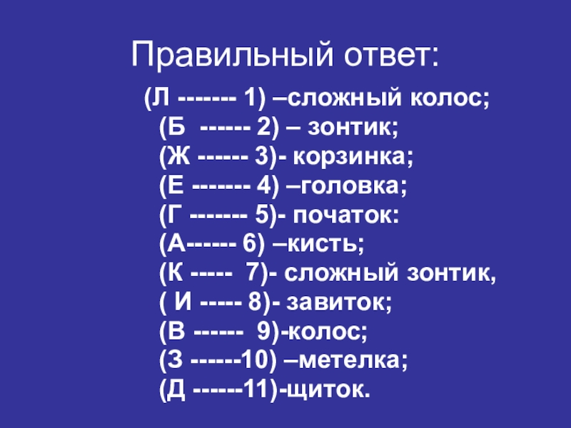 колос; 2 – зонтик; 3- корзинка; 4 –головка; 5- початок: 6 –кисть; 7- сложный зонтик, 8- завиток; 9-колос; 10 –метелка;11-щиток.