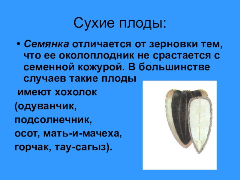 Семянка отличается от зерновки тем, что ее околоплодник не срастается