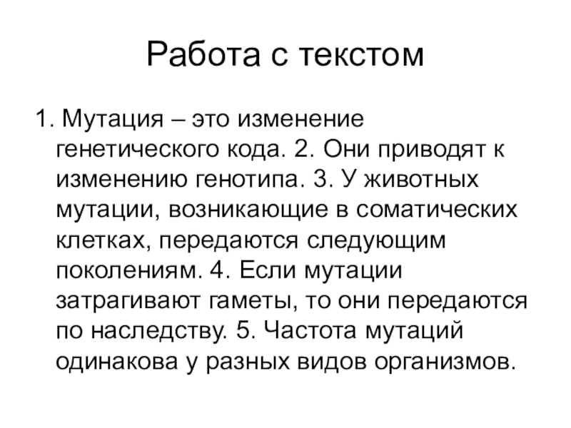 приводят к изменению генотипа. 3. У животных мутации, возникающие в соматических клетках, передаются следующим поколениям. 4. Если мутации затрагивают гаметы, то они передаются по наследству. 5. Частота мутаций одинакова у разных видов организмов.