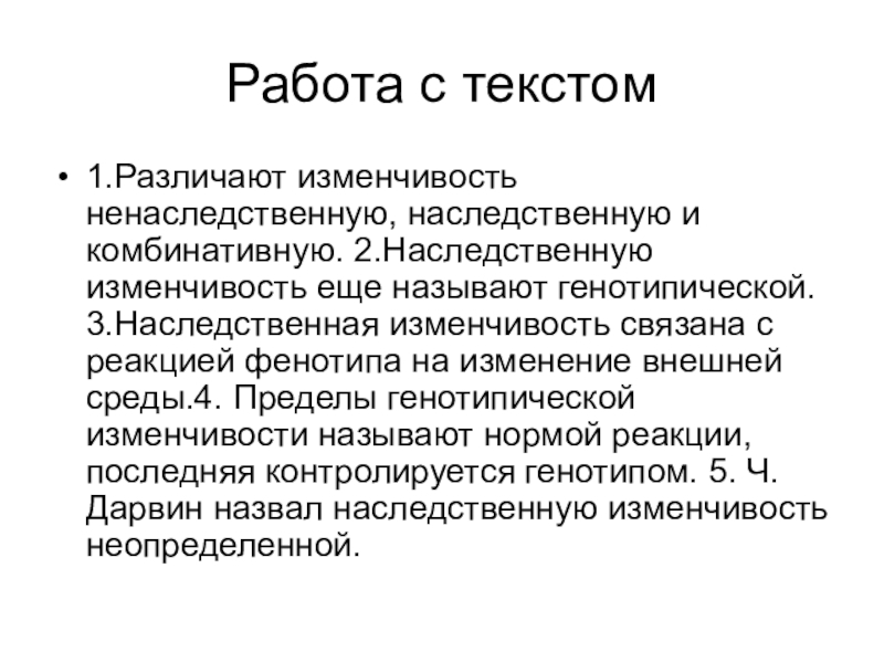называют генотипической. 3.Наследственная изменчивость связана с реакцией фенотипа на изменение внешней среды.4. Пределы генотипической изменчивости называют нормой реакции, последняя контролируется генотипом. 5. Ч.Дарвин назвал наследственную изменчивость неопределенной.