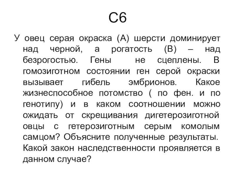 (В) – над безрогостью. Гены не сцеплены. В гомозиготном состоянии ген серой окраски вызывает гибель эмбрионов. Какое жизнеспособное потомство ( по фен. и по генотипу) и в каком соотношении можно ожидать от скрещивания дигетерозиготной овцы с гетерозиготным серым комолым самцом? Объясните полученные результаты. Какой закон наследственности проявляется в данном случае?