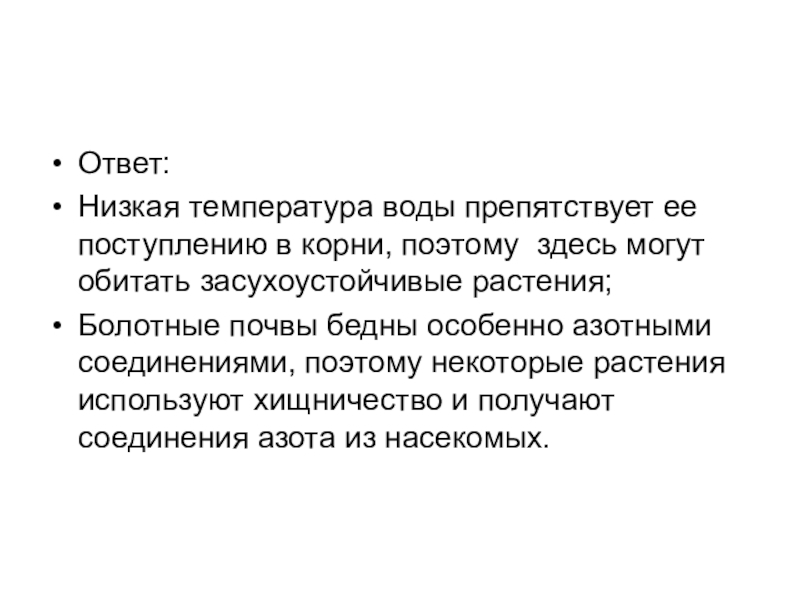 Болотные почвы бедны особенно азотными соединениями, поэтому некоторые растения используют хищничество и получают соединения азота из насекомых.