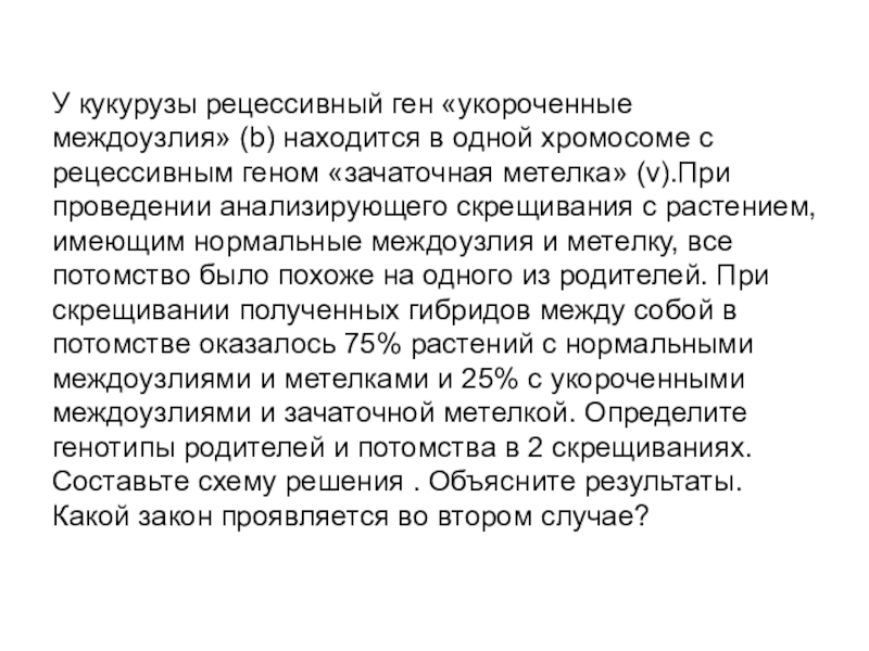 с рецессивным геном «зачаточная метелка» (v).При проведении анализирующего скрещивания с растением, имеющим нормальные междоузлия и метелку, все потомство было похоже на одного из родителей. При скрещивании полученных гибридов между собой в потомстве оказалось 75% растений с нормальными междоузлиями и метелками и 25% с укороченными междоузлиями и зачаточной метелкой. Определите генотипы родителей и потомства в 2 скрещиваниях. Составьте схему решения . Объясните результаты. Какой закон проявляется во втором случае?