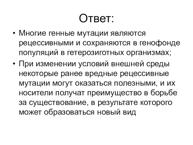 При изменении условий внешней среды некоторые ранее вредные рецессивные мутации могут оказаться полезными, и их носители получат преимущество в борьбе за существование, в результате которого может образоваться новый вид
