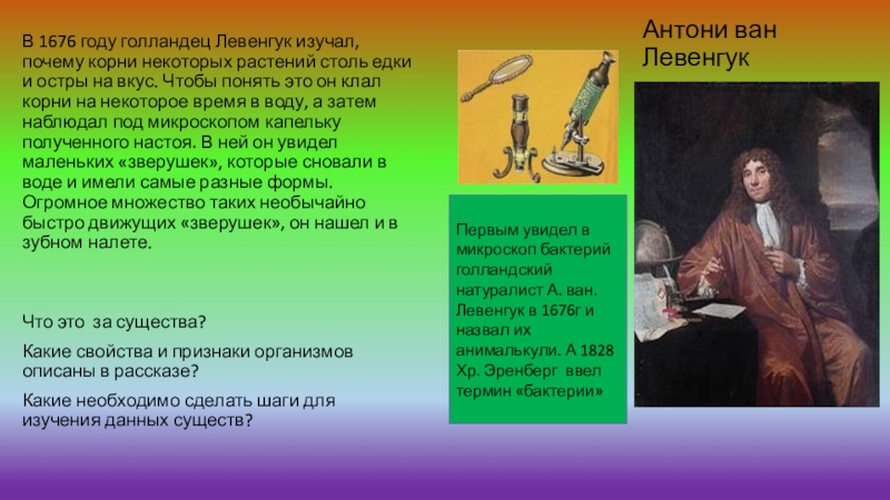Первым увидел в микроскоп бактерий голландский натуралист А. ван. Левенгук в 1676г и назвал их анималькули. А 1828 Хр. Эренберг ввел термин «бактерии»