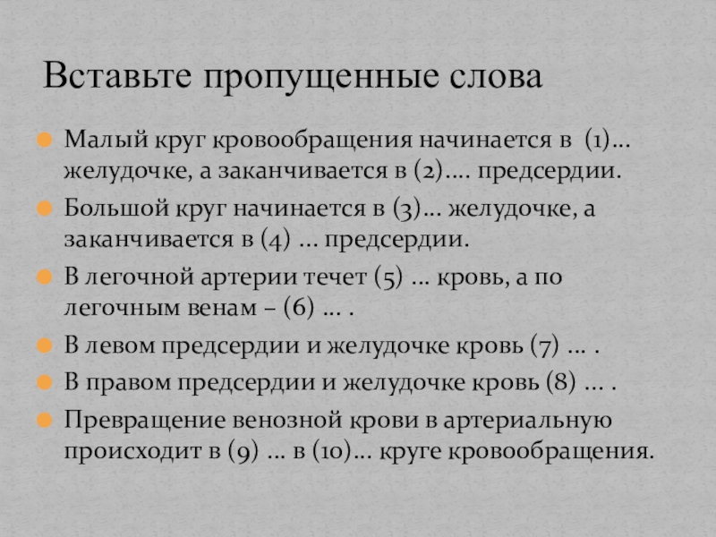 Соотнесите обозначенные цифрами части сердца и названия, обозначенные буквами