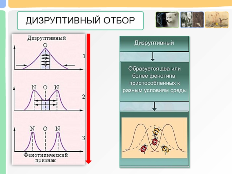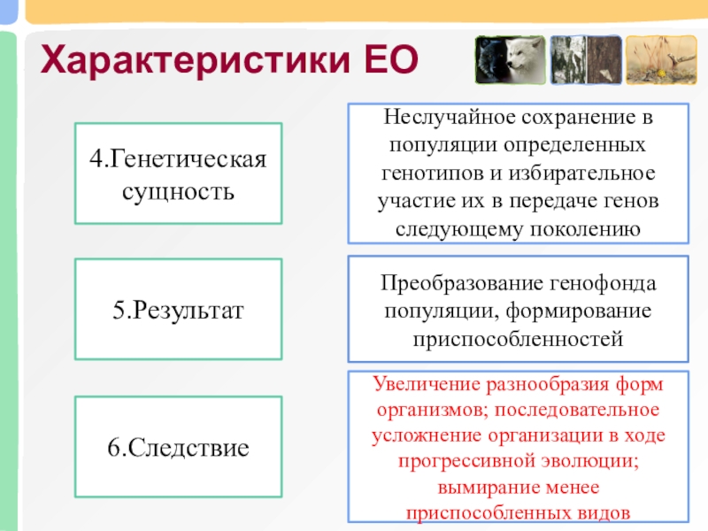 Увеличение разнообразия форм организмов; последовательное усложнение организации в ходе прогрессивной эволюции; вымирание менее приспособленных видов