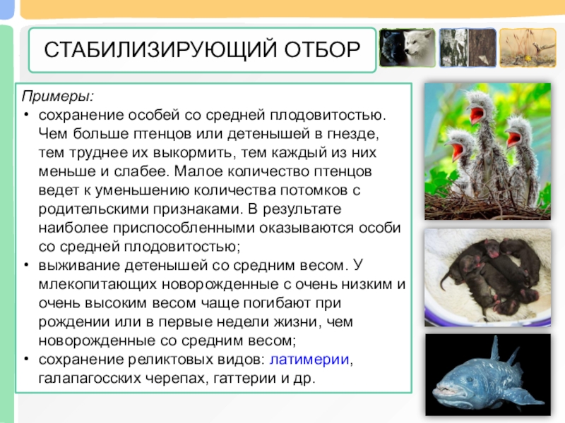 стабилизирующий отбор — форма естественного отбора, при котором действие направлено против особей, имеющих крайние отклонения от средней нормы, в пользу особей со средней выраженностью признака. Происходит при постоянных условиях окружающей среды.