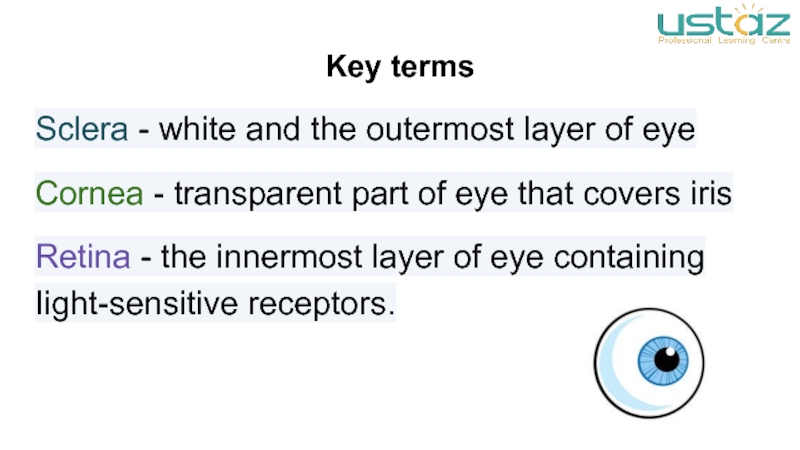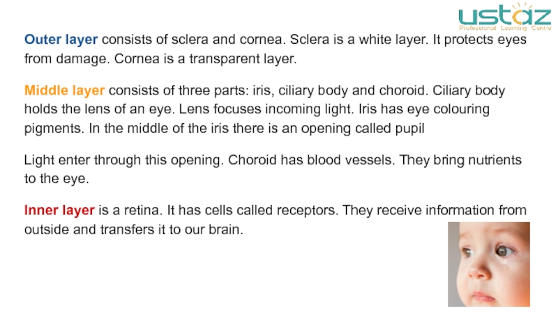 Слайд 11Outer layer consists of sclera and cornea. Sclera is a white