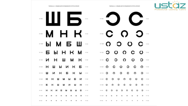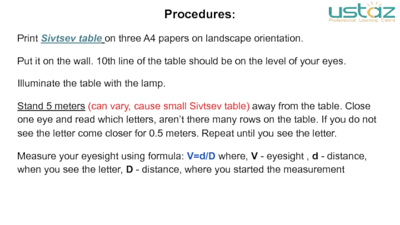 Stand 5 meters (can vary, cause small Sivtsev table) away from the table. Close one eye and read which letters, aren’t there many rows on the table. If you do not see the letter come closer for 0.5 meters. Repeat until you see the letter.