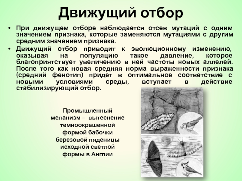 Промышленный меланизм – вытеснение темноокрашенной формой бабочки березовой пяденицы исходной светлой формы в Англии