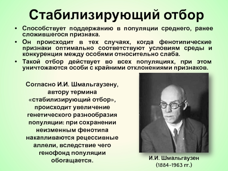 Согласно И.И. Шмальгаузену, автору термина «стабилизирующий отбор», происходит увеличение генетического разнообразия популяции: при сохранении неизменным фенотипа накапливаются рецессивные аллели, вследствие чего генофонд популяции обогащается.
