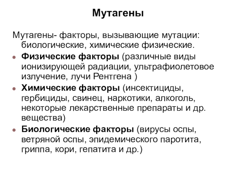 Мутагены- факторы, вызывающие мутации: биологические, химические физические.