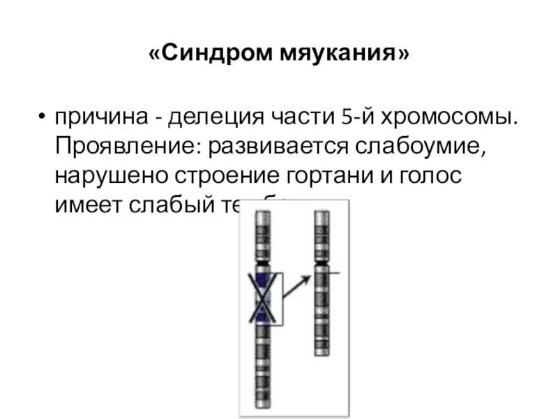 причина - делеция части 5-й хромосомы. Проявление: развивается слабоумие, нарушено