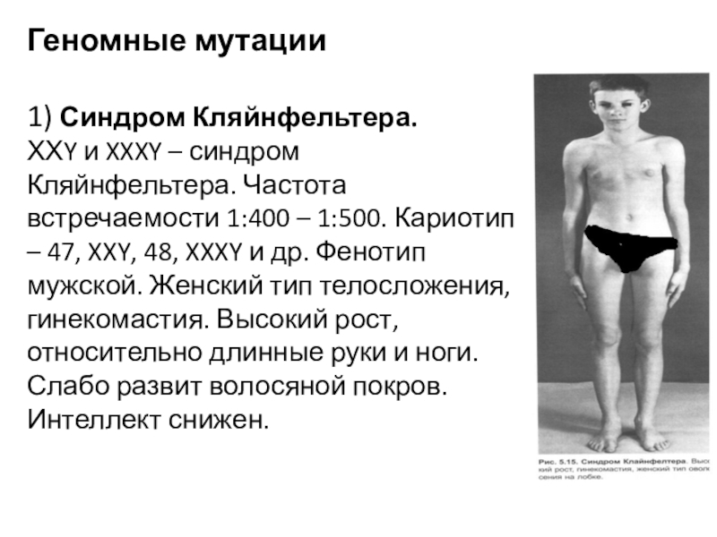 1:400 – 1:500. Кариотип – 47, XXY, 48, XXXY и др. Фенотип мужской. Женский тип телосложения, гинекомастия. Высокий рост, относительно длинные руки и ноги. Слабо развит волосяной покров. Интеллект снижен.