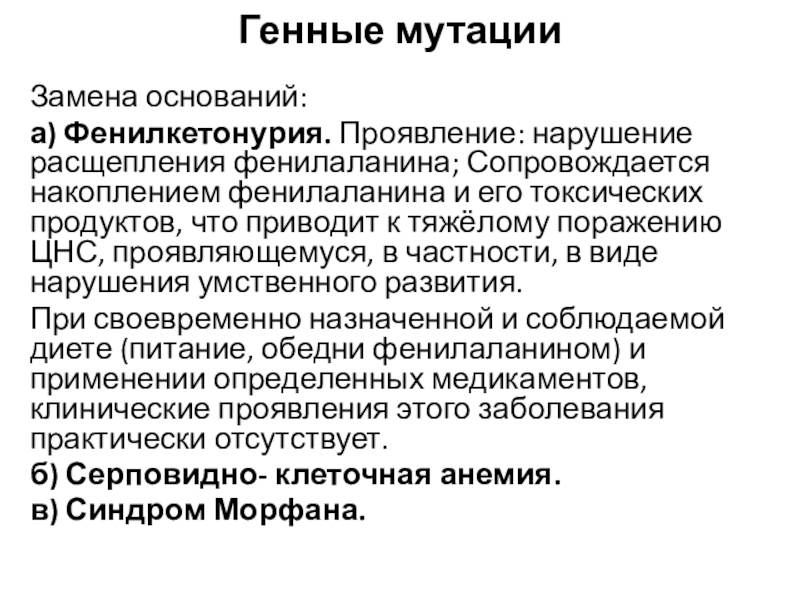 а) Фенилкетонурия. Проявление: нарушение расщепления фенилаланина; Сопровождается накоплением фенилаланина