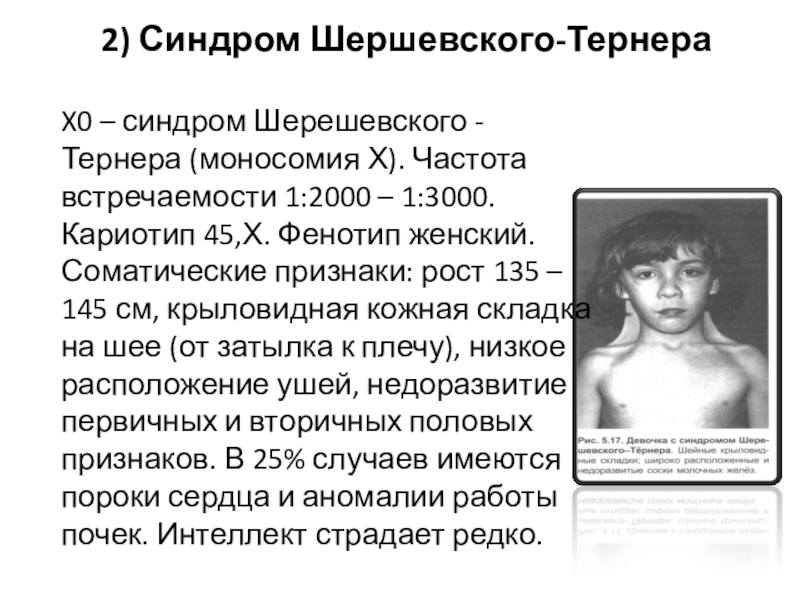 1:2000 – 1:3000. Кариотип 45,Х. Фенотип женский. Соматические признаки: рост 135 – 145 см, крыловидная кожная складка на шее (от затылка к плечу), низкое расположение ушей, недоразвитие первичных и вторичных половых признаков. В 25% случаев имеются пороки сердца и аномалии работы почек. Интеллект страдает редко.
