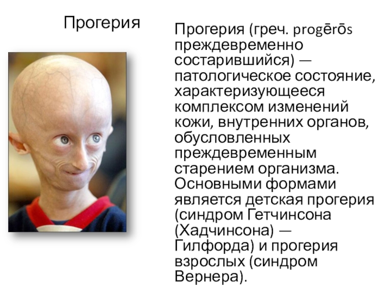 кожи, внутренних органов, обусловленных преждевременным старением организма. Основными формами является детская прогерия (синдром Гетчинсона (Хадчинсона) — Гилфорда) и прогерия взрослых (синдром Вернера).