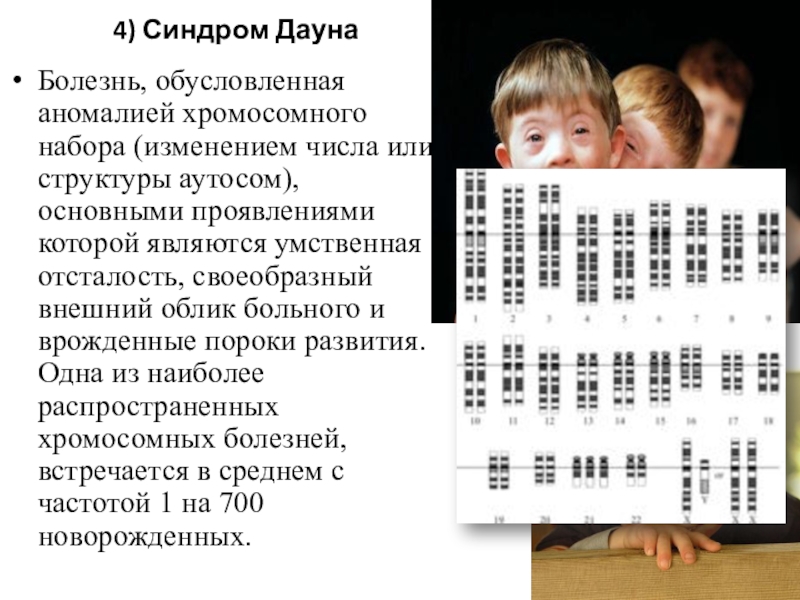 аутосом), основными проявлениями которой являются умственная отсталость, своеобразный внешний облик больного и врожденные пороки развития. Одна из наиболее распространенных хромосомных болезней, встречается в среднем с частотой 1 на 700 новорожденных.