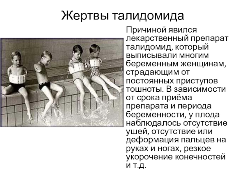 Причиной явился лекарственный препарат талидомид, который выписывали многим беременным женщинам,