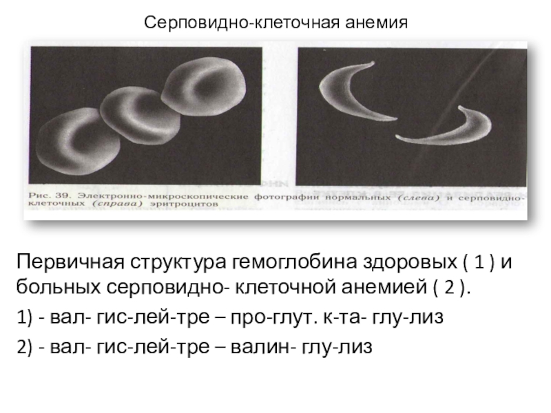 Первичная структура гемоглобина здоровых ( 1 ) и больных серповидно-
