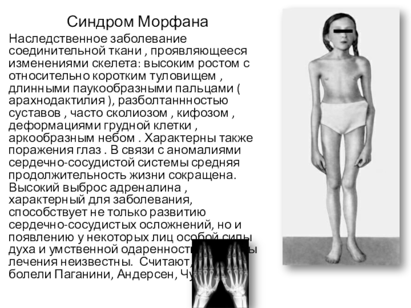 с относительно коротким туловищем , длинными паукообразными пальцами ( арахнодактилия ), разболтаннностью суставов , часто сколиозом , кифозом , деформациями грудной клетки , аркообразным небом . Характерны также поражения глаз . В связи с аномалиями сердечно-сосудистой системы средняя продолжительность жизни сокращена. Высокий выброс адреналина , характерный для заболевания, способствует не только развитию сердечно-сосудистых осложнений, но и появлению у некоторых лиц особой силы духа и умственной одаренности. Способы лечения неизвестны. Считают, что ею болели Паганини, Андерсен, Чуковский.