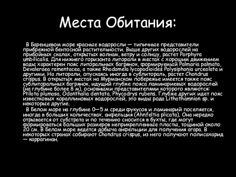 растительности. Выше других водорослей на прибойных скалах, открытых волнам, ветру и солнцу, растет Porphyra umbilicalis. Для нижнего горизонта литорали в местах с хорошим движением воды характерен пояс литоральных багрянок, формируемый Palmaria palmata, Devaleraea ramentacea, а также Rhodomela lycopodioides Polysiphonia urceolata и другими. На литорали, опускаясь иногда в сублитораль, растет Chondrus crispus. В открытых местах на Мурманском побережье имеется также пояс сублиторальных багрянок, идущий глубже пояса ламинариевых водорослей (на глубине более 8 м), основными представителями которого являются: Ptilota plumosa, Odonthalia dentata, Phycodrys rubens. Глубже других идет пояс известковых кораллиновых водорослей, это виды рода Lithothamnion sp. и некоторые другие.